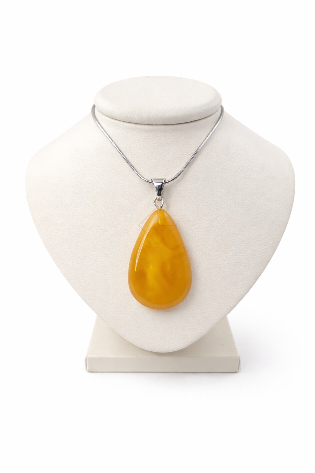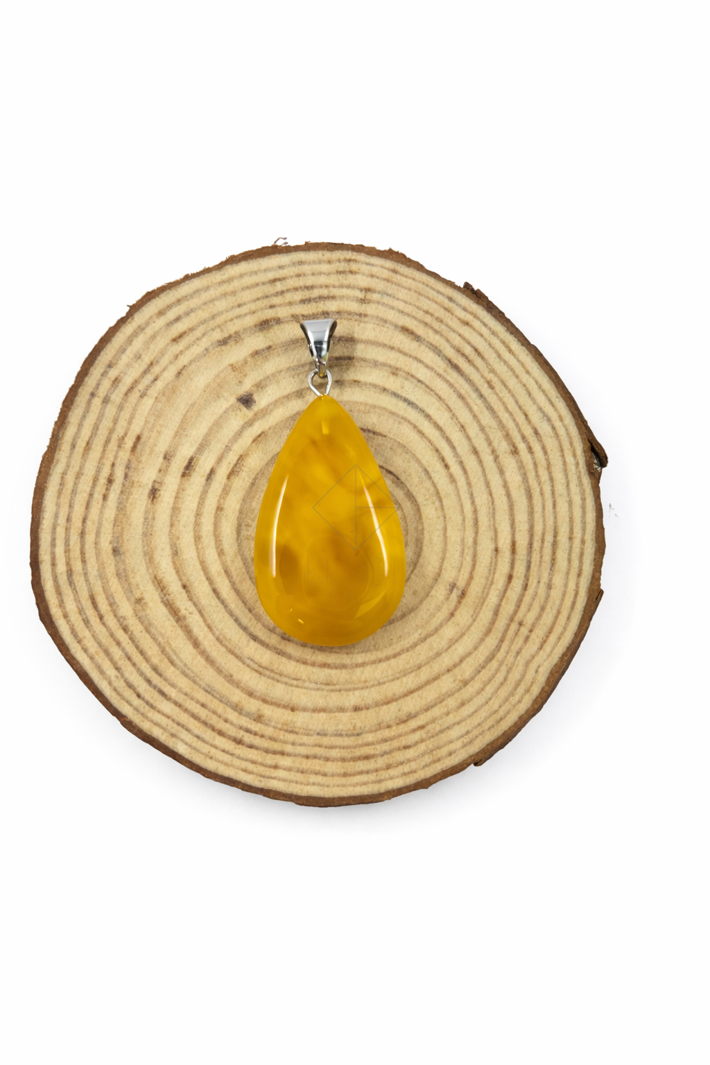 Zawieszka z żółtego bursztynu w kształcie kropli, osadzona na srebrnej krawatce.
