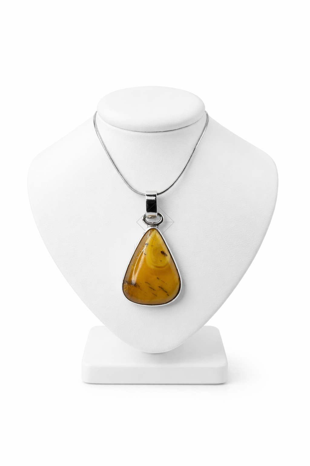 Elegancki wisiorek z naturalnym bursztynem w nowoczesnej, srebrnej oprawie.